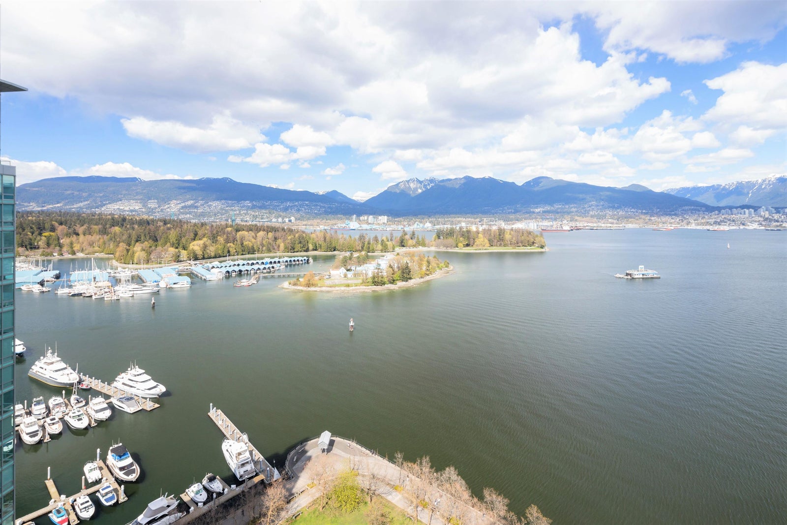 Sensational oceanfront home on a high floor at the prestigious, award-winning Callisto! Unobstructed sweeping views of ocean, north shore mountains, Stanley Park, Coal Harbour Marina, full view of the Lions Gate Bridge, Lost Lagoon & partial English Bay! With A/C. This stunning home takes an advantage of being on a high floor, boasting abundant natural light, bright & open space, and elevated views that evolve from morning to evening when the sky is painted in warm sunset colour. Meticulously maintained & move-in ready. A chef's kitchen w/ luxurious appliances & finishes. A huge family room/office offers great flexibility. A perfect home for gathering&entertaining. 2 side-by-side parking&storage locker. Amazing amenities: 24/7 concierge, indoor pool.