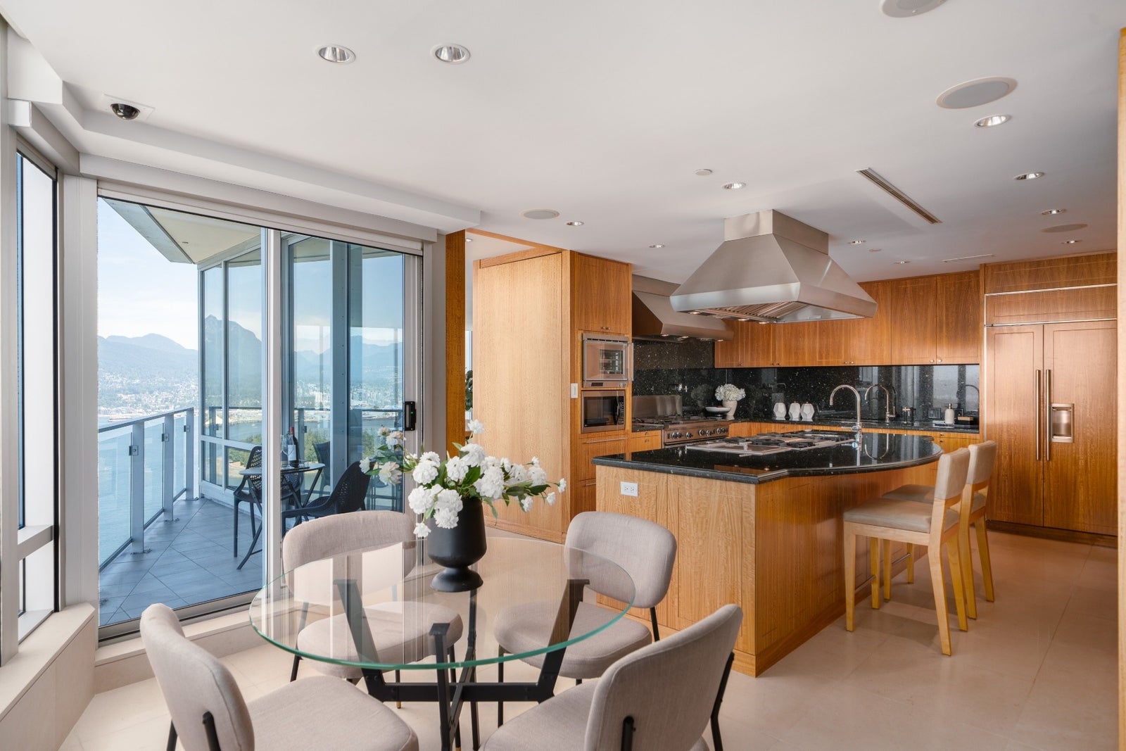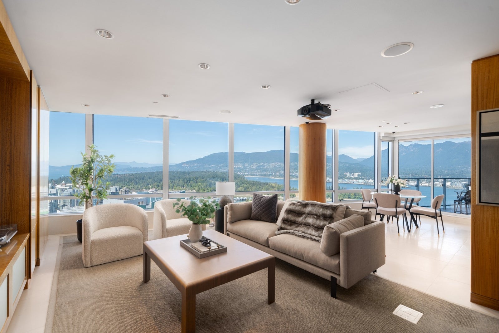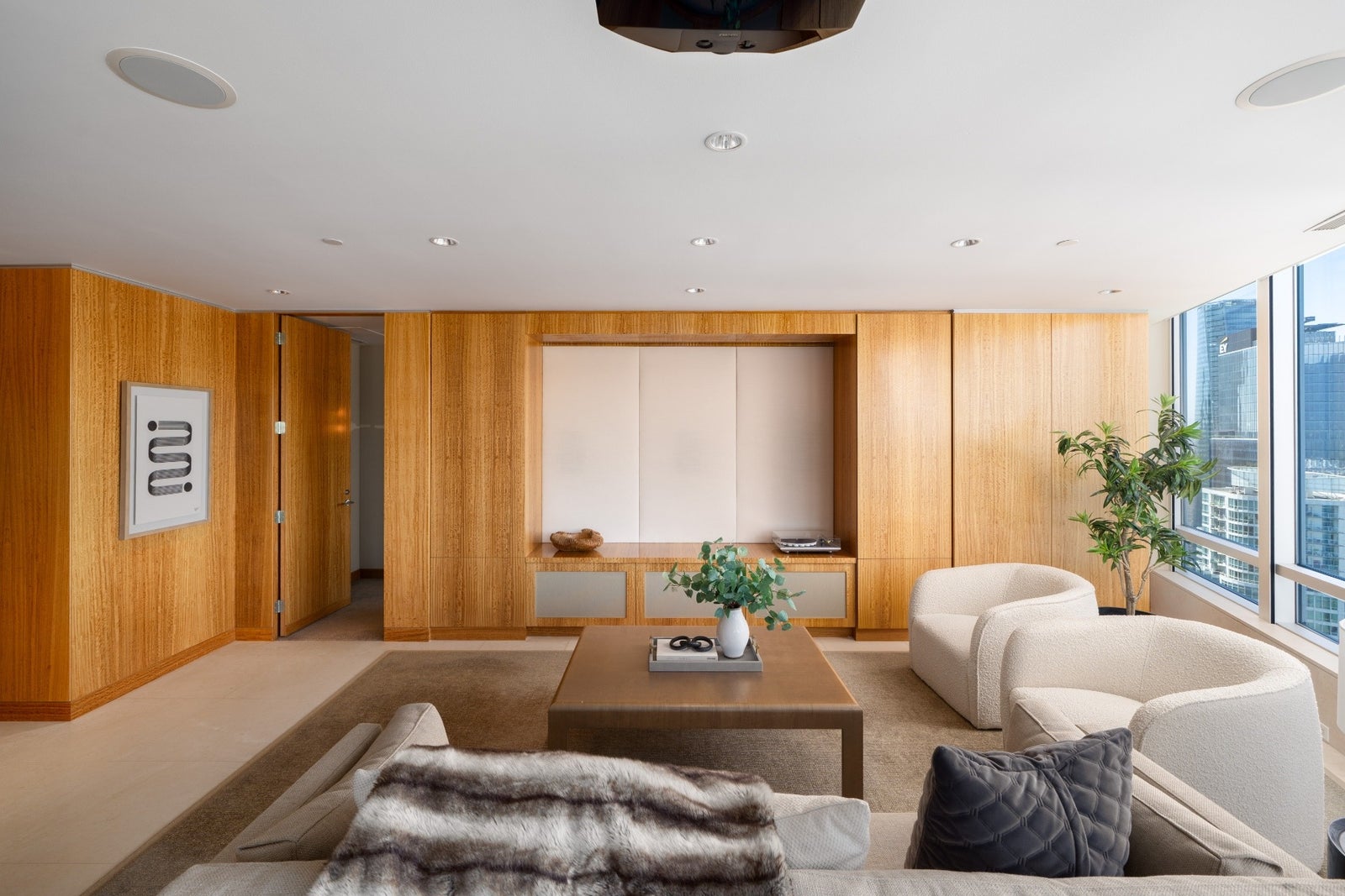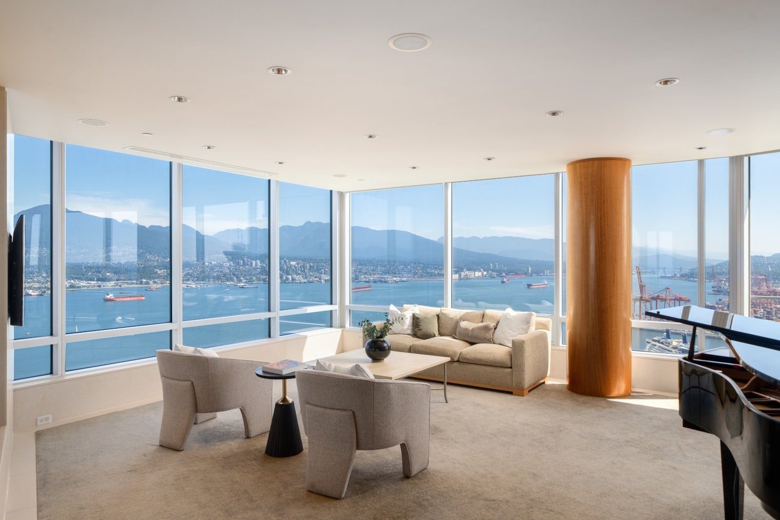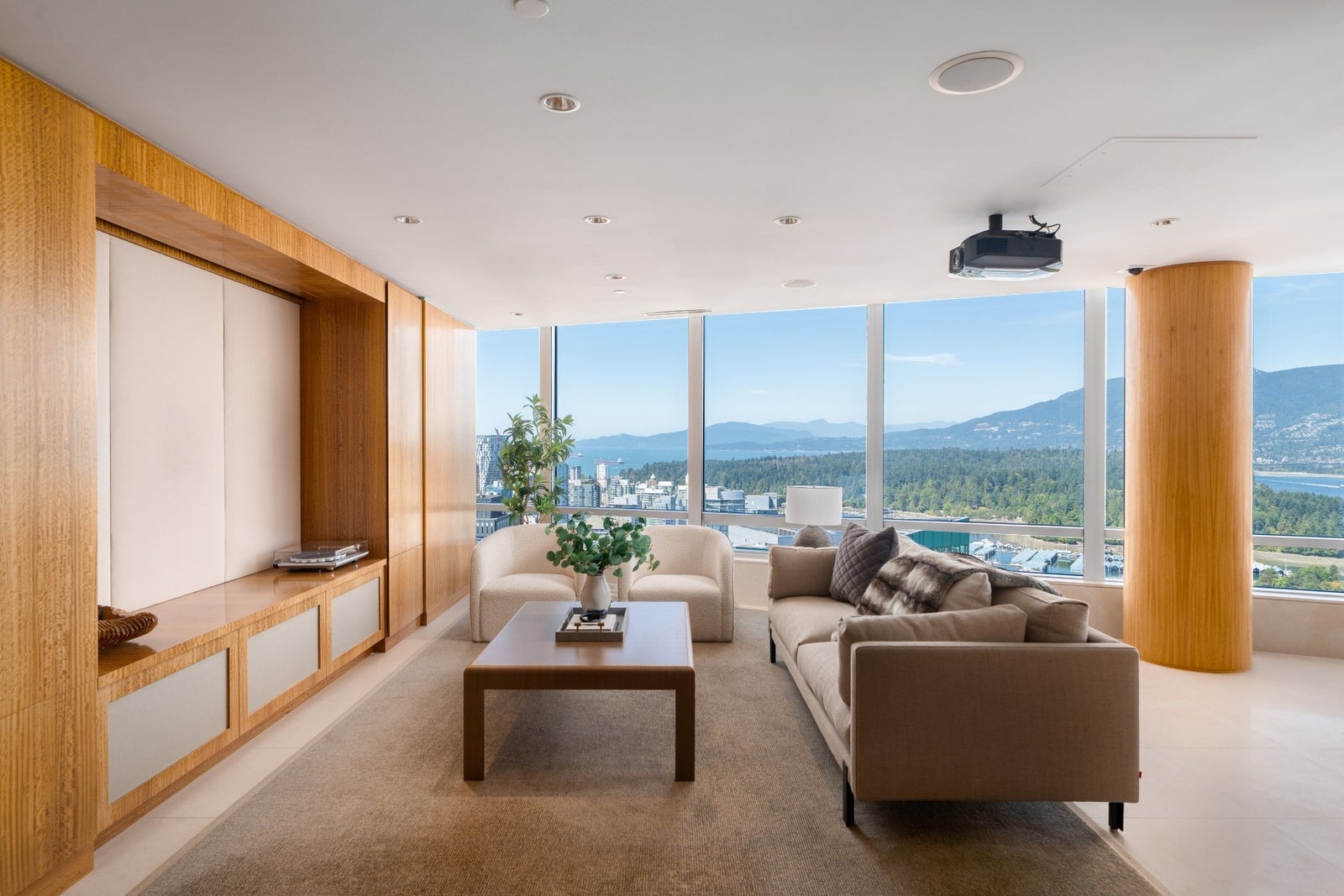 EXCLUSIVE LISTING | One-of-a-kind, spectacular residence in Rogers Tower, offering front row waterfront living in Coal Harbour. Redesigned by visionary Gregory Van Sickle, every detail was reimagined for function, flow, and beauty. Vast open living spaces, a sculptural gas fireplace, gallery-like walls, and floor-to-ceiling glass frame sweeping views of Stanley Park, Lions Gate Bridge, Second Narrows Bridge, the North Shore mountains, English Bay, and the city skyline. The 4,080 sq.ft. layout includes three spacious bedrooms, each with an ensuite, a family room, media room, formal dining room, wet bar, and a gourmet kitchen with custom cabinetry. Imported Australian eucalyptus wall paneling runs throughout, adding warmth and texture. Bathrooms feature onyx, granite, and marblefinishes, while a temperature-controlled wine cellar elevates entertaining. Smart-home technology provides a Multi-Room Distributed Music System, Automated Lighting Control, and a fully integrated Suite Automation System for effortless control, including automated sunshades and blackout blinds. Building amenities are second to none: a 17-seat professional screening room, executive boardroom, designer-furnished meeting spaces, a 3,900-sq.ft. health club with gym, fitness studio, massage room, infrared sauna, and more. Set just steps from Vancouver’s finest restaurants and high-end shops, this residence offers an unmatched lifestyle of convenience and prestige. From stunning sunrises to golden sunsets and glittering nightscapes, the views shift by the minute—living art in motion. This is a home that simply cannot be replicated.